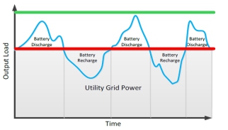 假定我們在2000KVA變壓器和配電系統(tǒng)后帶一套2500KW的UPS系統(tǒng),設(shè)計帶平均值為2000KW的IT負(fù)荷。當(dāng)IT負(fù)荷處于波峰時段達(dá)到2400KW時,UPS會同時利用從電網(wǎng)吸入的2000KW功率+電池組提供的400KW功率,通過逆變器給2400KW的IT負(fù)荷供電。利用鋰電池儲存的能量短時間內(nèi)應(yīng)對IT峰值,同時又不讓變壓器和配電系統(tǒng)過載。