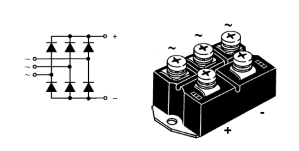 我們通常把將交流變換為直流的過程稱之為整流。變頻器所采用的整流方式通常是三相全橋不可控整流,整流器件為將6顆整流二極管模塊化封裝的整流橋堆,俗稱整流橋。整流橋的參數(shù)主要就是額定電流值和耐壓值。